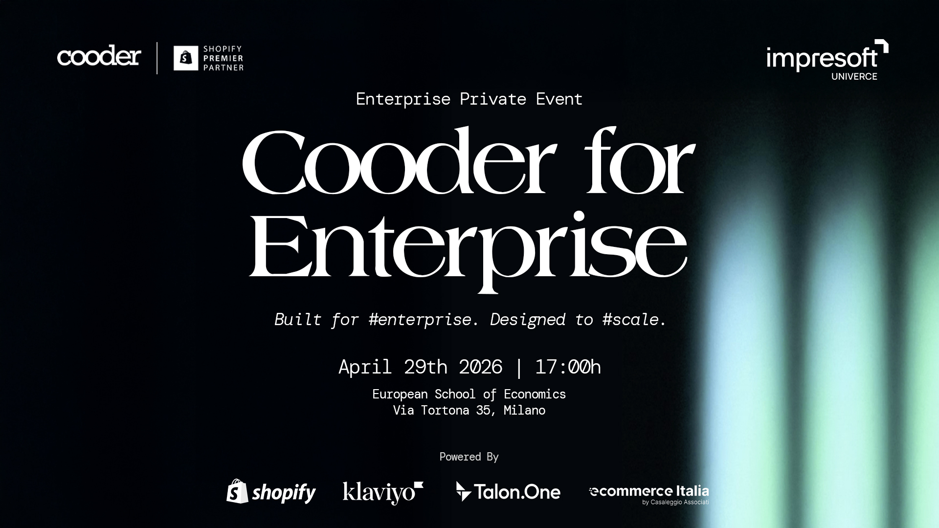 Cooder for Enterprise è un evento a numero chiuso, su invito, che riunisce C-level tra cui CTO, CIO e Head of eCommerce delle principali realtà enterprise del Paese. Non si tratta di una demo di prodotto: è un momento di confronto strategico tra chi sta valutando o ha già avviato percorsi di evoluzione delle proprie piattaforme digitali.
